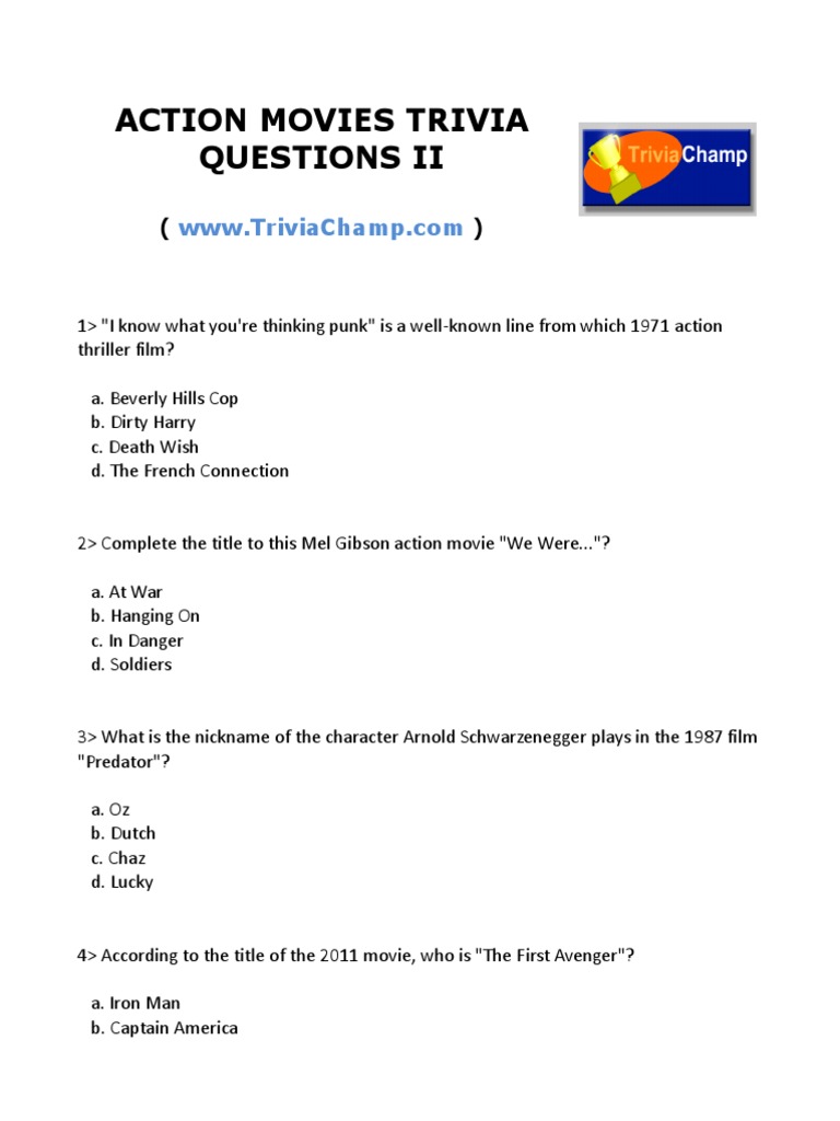 Action Trivia Questions / Our online geometry trivia quizzes can be adapted to suit your requirements for taking some of the top geometry quizzes.. Trivia today is a world of fun and exciting questions on history, entertainment, science, music, literature, pop culture and so much more. Oct 25, 2021 · every guy needs good bar trivia questions. Aug 03, 2021 · christmas trivia questions are a great way to keep people engaged and entertained during the christmas season. Combine them with icebreaker games and our collection of questions to ask and to make the lockdown more bearable. Did you know that the first computer was almost 2.5 meters high?